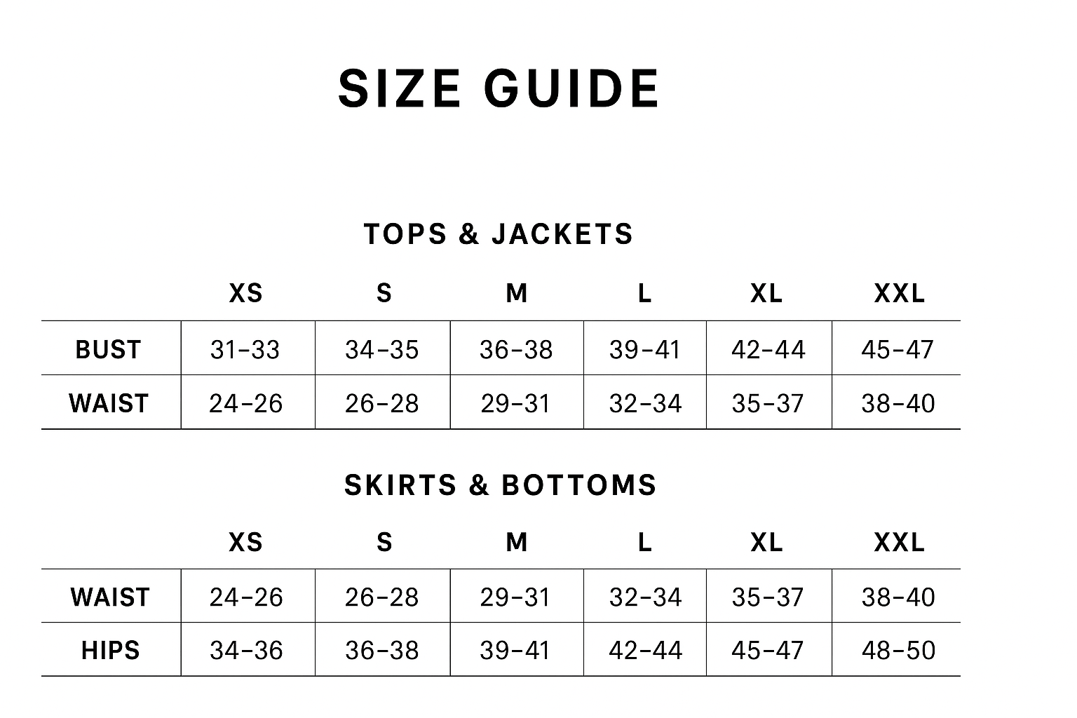 XS (0–2): Bust 31–33" | Waist 24–26"